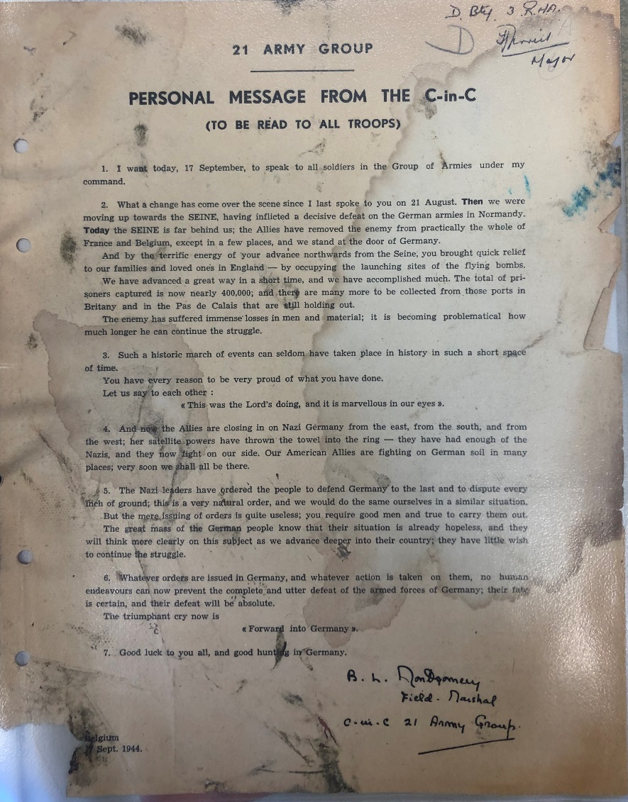 16. | DITTO - weather fine Capt. D.D. Yonge MC. R.H.A to 50 Div front, but called back in afternoon after slow and difficult progress/ Much patrol work on both sides in 131 Bde front with much D.F. fire out down at noght. | |