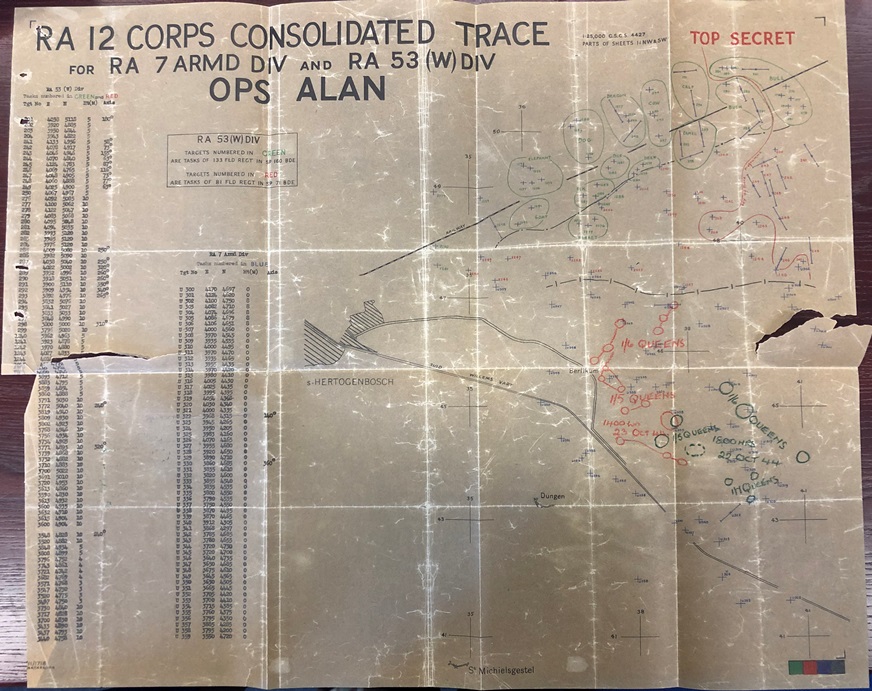CONDE 829705. weather good. Early morning STONKS on TILLY in support of 131 Bde attack (1/5 Queens leading)/ Our forces met enemy armour in some strenghth and O.P.s found progress slow because of bad observation owing to difficult country, and the odd spandau and shell/ Late orders to move next morning. |
