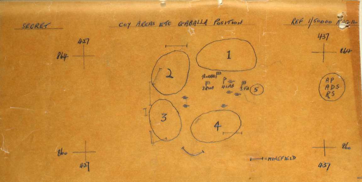 WILSON column moves to area C.4090 and with one O.P. out watch West and North-West up the track HASEIAT C.4586 – AGADEBIA safeguarding the right flank of CURRIE and SQUEAK columns which have moved on S.W. down the WADI FAREGH. WILSON column not engaged. |