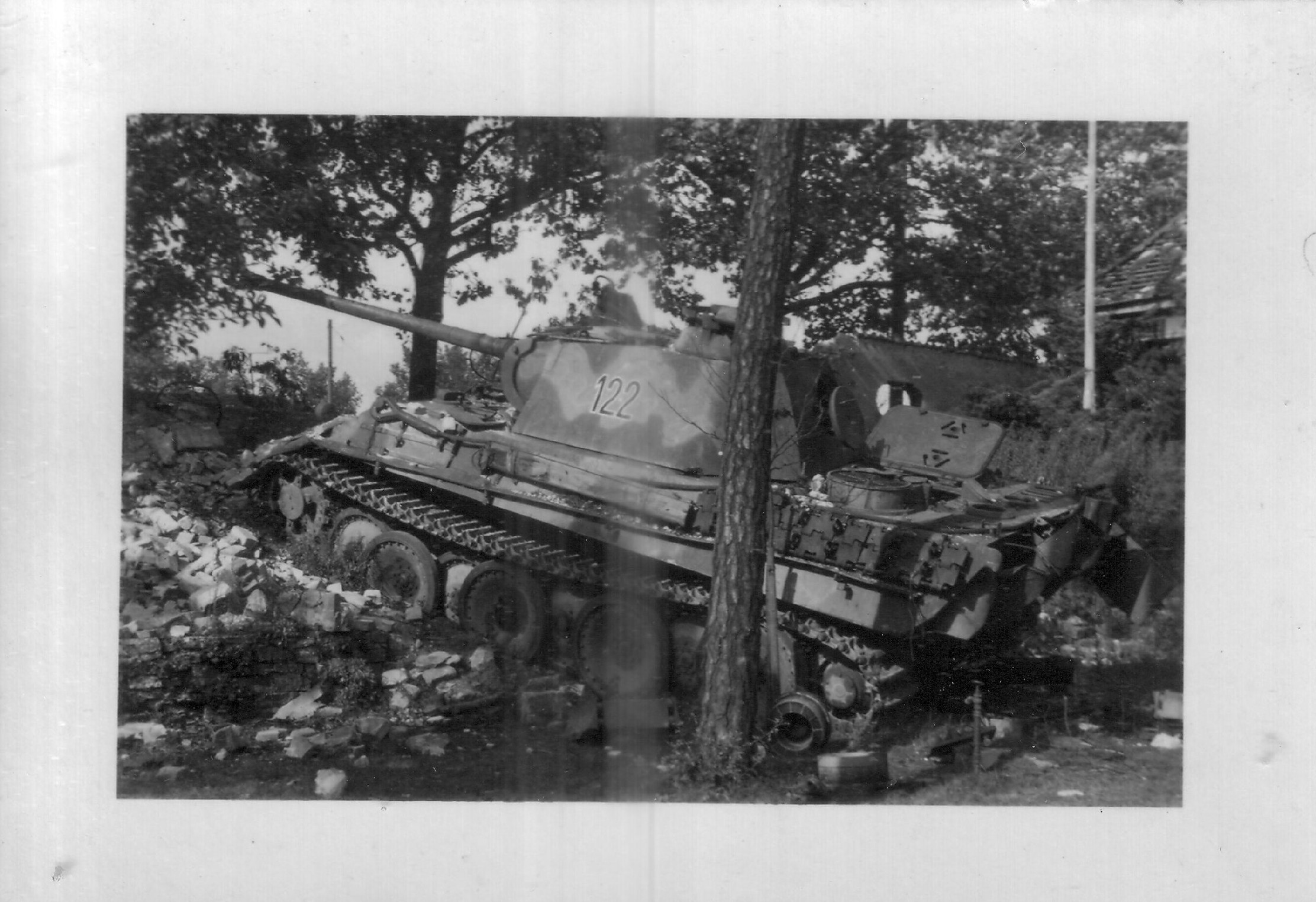 A hull down Panther tank in Berlin, with a Russian sign behind it. |